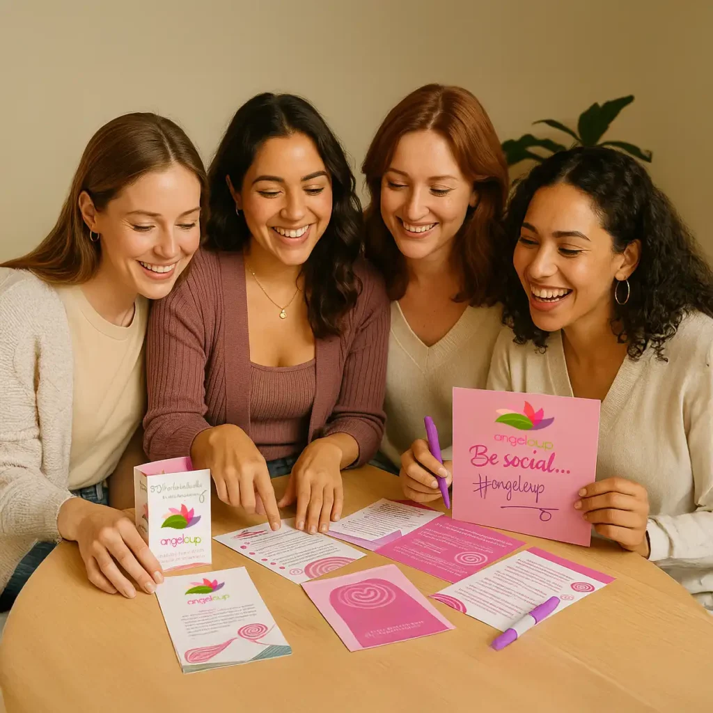 [SUGERENCIA DE IMAGEN: SUGERENCIA DE IMAGEN: Varias mujeres diversas, embajadoras Angelcup, colaborando y compartiendo ideas en un ambiente de apoyo, con materiales de marketing de Angelcup esparcidos en una mesa. ALT TEXT SUGERIDO: Comunidad de embajadoras Angelcup colaborando y recibiendo apoyo, construyendo un negocio exitoso.]