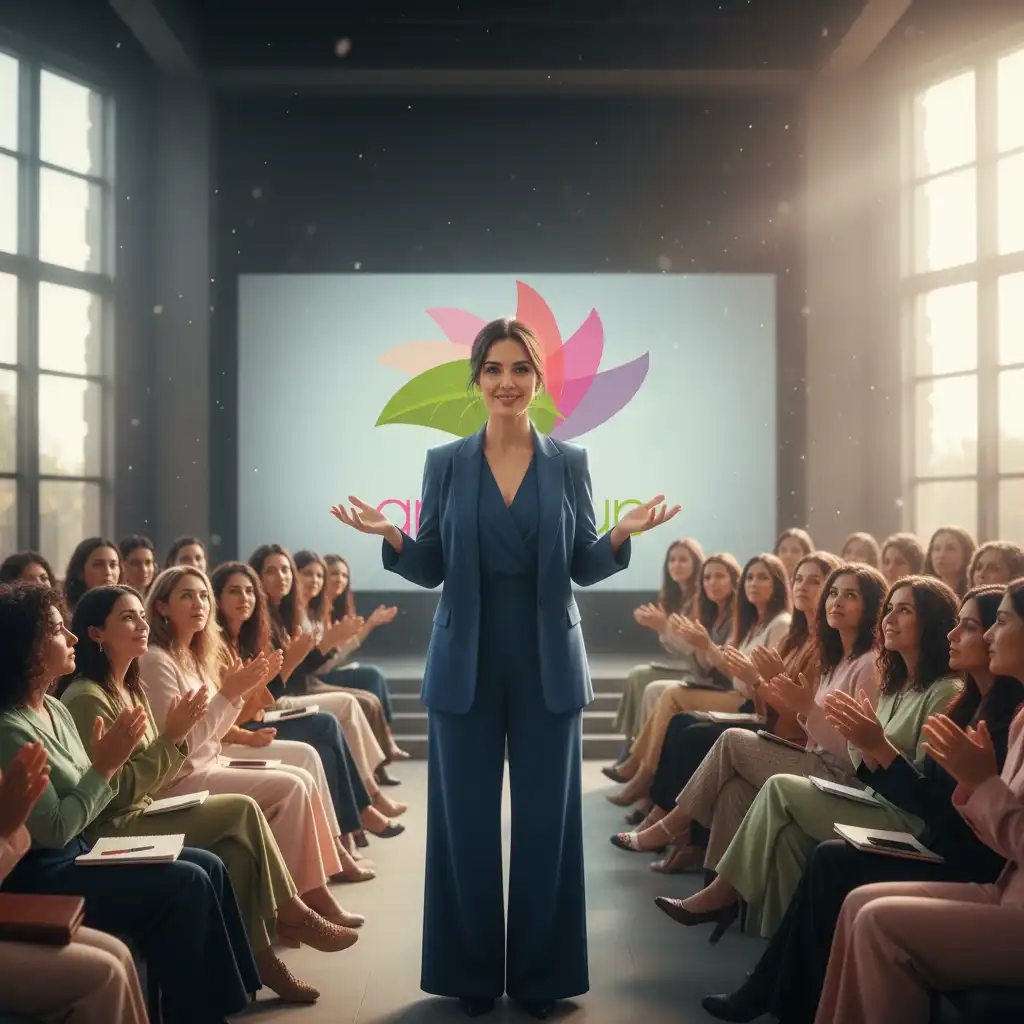 [SUGERENCIA DE IMAGEN: SUGERENCIA DE IMAGEN: Una mujer de pie frente a un grupo de otras mujeres, todas atentas y empoderadas, con un aura de liderazgo y sabiduría. ALT TEXT SUGERIDO: Mujer líder del cambio inspirando a una comunidad, con productos Angelcup de fondo.]