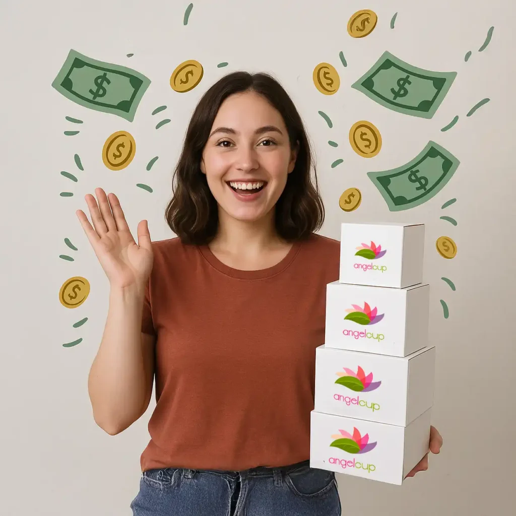 [SUGERENCIA DE IMAGEN: SUGERENCIA DE IMAGEN: Una embajadora feliz mostrando una pila de productos Angelcup, con billetes y monedas cayendo a su alrededor de forma estilizada. ALT TEXT SUGERIDO: Mujer feliz demostrando el margen de ganancia de Angelcup, con productos y dinero.]